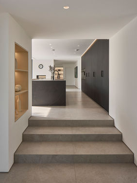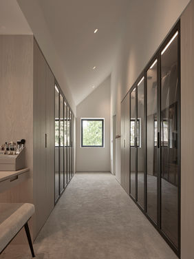 Careful consideration has also been given to the ancillary spaces throughout the home. On the ground floor, a cleverly concealed pantry, boot room, and utility area are hidden behind the tall cabinetry of the kitchen, accessible through discreet doors that maintain the sleek aesthetic of the space. Similarly, on the first floor, a private dressing area and walk-in wardrobe are tucked subtly behind the master bedroom wall, adding to the seamless elegance and thoughtful functionality of the design.