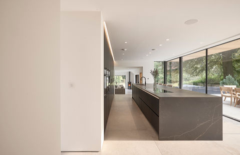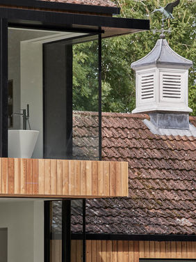 The extension's upper floor adopts a similarly thoughtful approach, where a vaulted master bedroom and en-suite are strategically positioned to gaze out over the grounds. Large, cantilevered windows project from the bedroom, creating a sensation of floating amidst the treetops. Here, passive solar shading is incorporated into the architecture, with the cantilevered first floor sheltering the expansive glass sliding doors below. An elegant projecting aluminium frame provides additional shading for the bedroom and en-suite, ensuring privacy from nearby residences, which are discreetly tucked behind a screen of mature trees to the south. The en-suite itself becomes a room of serenity, enhanced by large corner glazing that immerses the space in natural light and offers expansive views of the garden. The freestanding bath seemingly extends into the trees, creating a unique sense of being suspended amidst nature.
