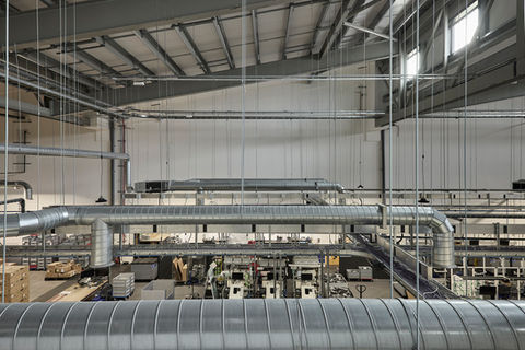 In addition to the production facilities the new building also incorporates a new double height reception space, offices, staff restaurant and a design suite overlooking the production area below. A consistent palette of materials, colour and strategic approach to services has created a cohesive style throughout the building that is modern and befitting of such a forward thinking business.