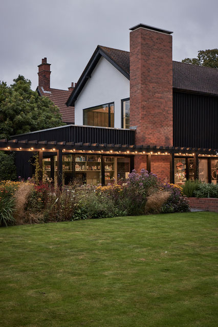 The cladding pattern has been carefully aligned to complement the original building’s decorative string course, which was painted black to emulate the Tudor style of neighbouring properties. The south-facing extension, featuring expansive glazed walls, connects the interior to the sprawling landscape, flooding the space with natural light and offering uninterrupted views.